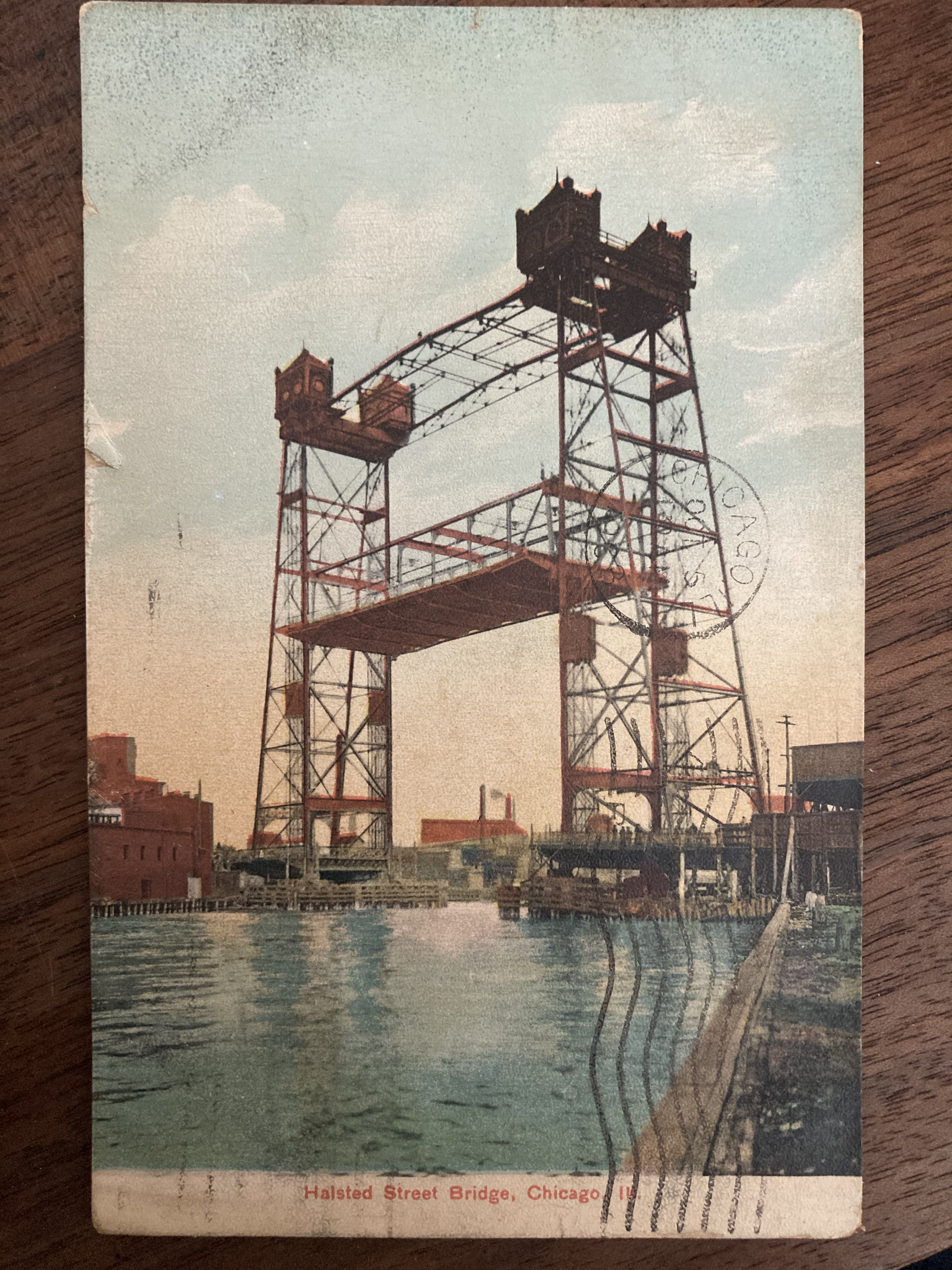 Over the past year, I’ve bought a few vintage inspired postcards, not that I’ve traveled very much. When you set these next to the antique postcards they’re intended to recreate, they look awful. The original postcards were the product of more than just a mechanical process of photographic reproduction, they were made by skilled artisans who understood lithographic printing better than anyone alive today. The colors are rich and well chosen—the result of subtle choices made by the printer. They’re printed on high quality paper. A digital image, filtered and processed to look ‘vintage,’ printed on cheap, coated card stock can’t compare. These small pieces of art are sold for very little—so long as you’re not particular—at antique stores and flea markets everywhere. Postcards were popular, the texting of their day. Here’s a message on the back of the image of the Halsted Street Bridge below: “Does this look familiar? Chicago. All right, at the depot with my ticket. What’s the matter with the Sox? Lucy” Just a casual message from the fifth of October, 1908. Nothing important.