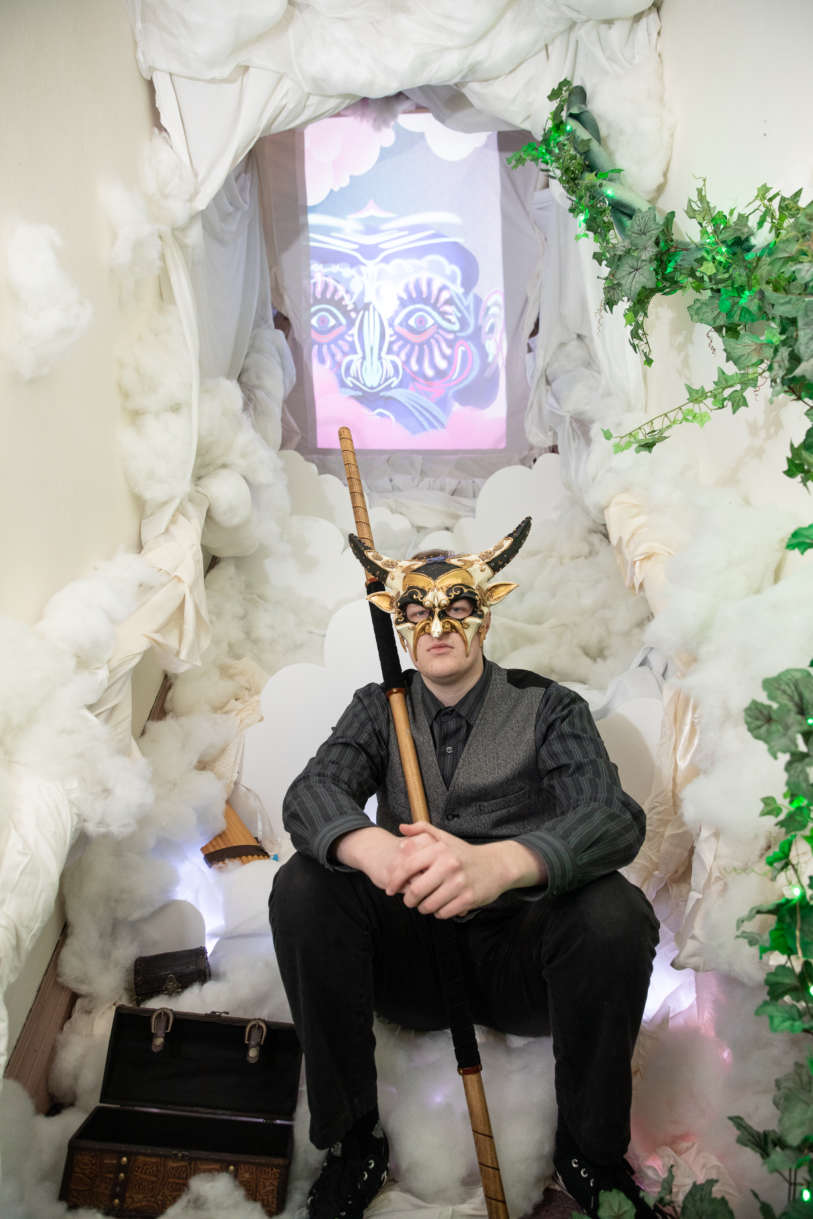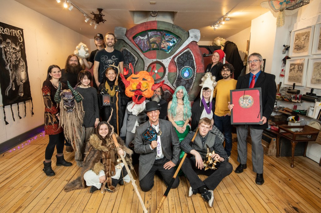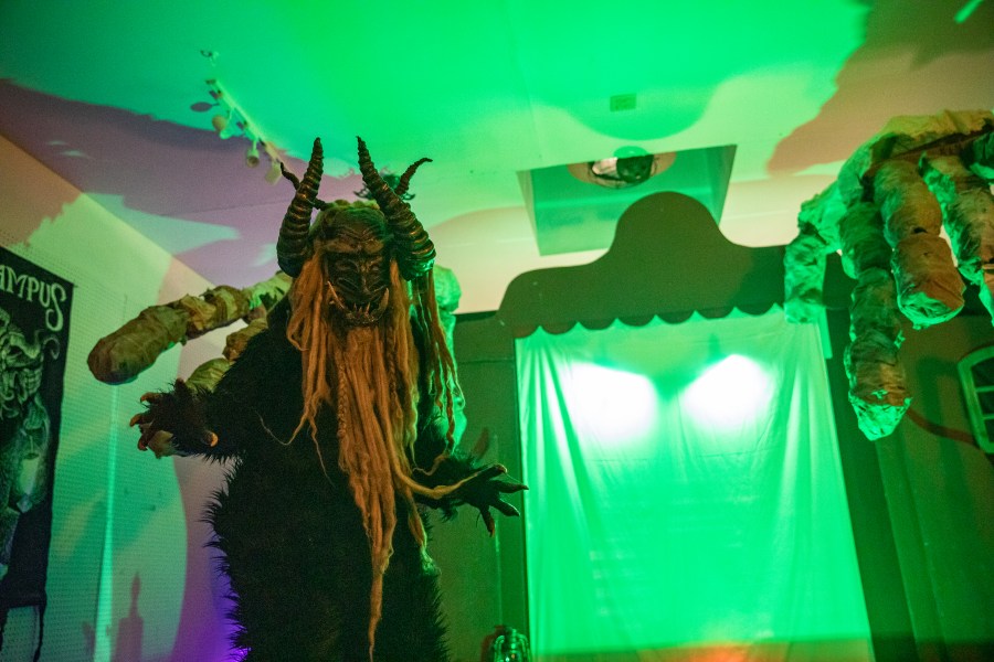 On a Saturday evening in early December, Don Krumpos* and his team presented “Krampus Claws Is Coming to Town” at Yonder, Krumpos’ art gallery and studio in Algoma, Wisconsin. Using a blend of storytelling, shadow play, illustrations made from simulated stained glass, and immersive theater, Krumpos and his troupe told an original story using elements of the German and Icelandic Christmas folk traditions. First, there was Krampus, St. Nick’s horned and bearded co-worker, who has been punishing the wicked children of Germany for centuries. This Christmas, Krampus discovered that morality is not as simple as black and white, that ‘bad’ kids are sometimes good kids in bad circumstances. Initially he’s perplexed by this moral ambiguity, but by the end of the show he’s taken it to heart and found a new role to play during Christmas. Then there was Gryla, a giantess who traditionally punishes the misbehaving children of Iceland with the help of the “Yule Lads” and her terrifying Yule Cat. (Apparently Iceland has a more interesting Christmas season than we do). In Yonder’s retelling, Gryla and her minions have been locked beneath the earth for a thousand years, bound by magical spells cast with air, water, and fire. And these bonds are weakening…