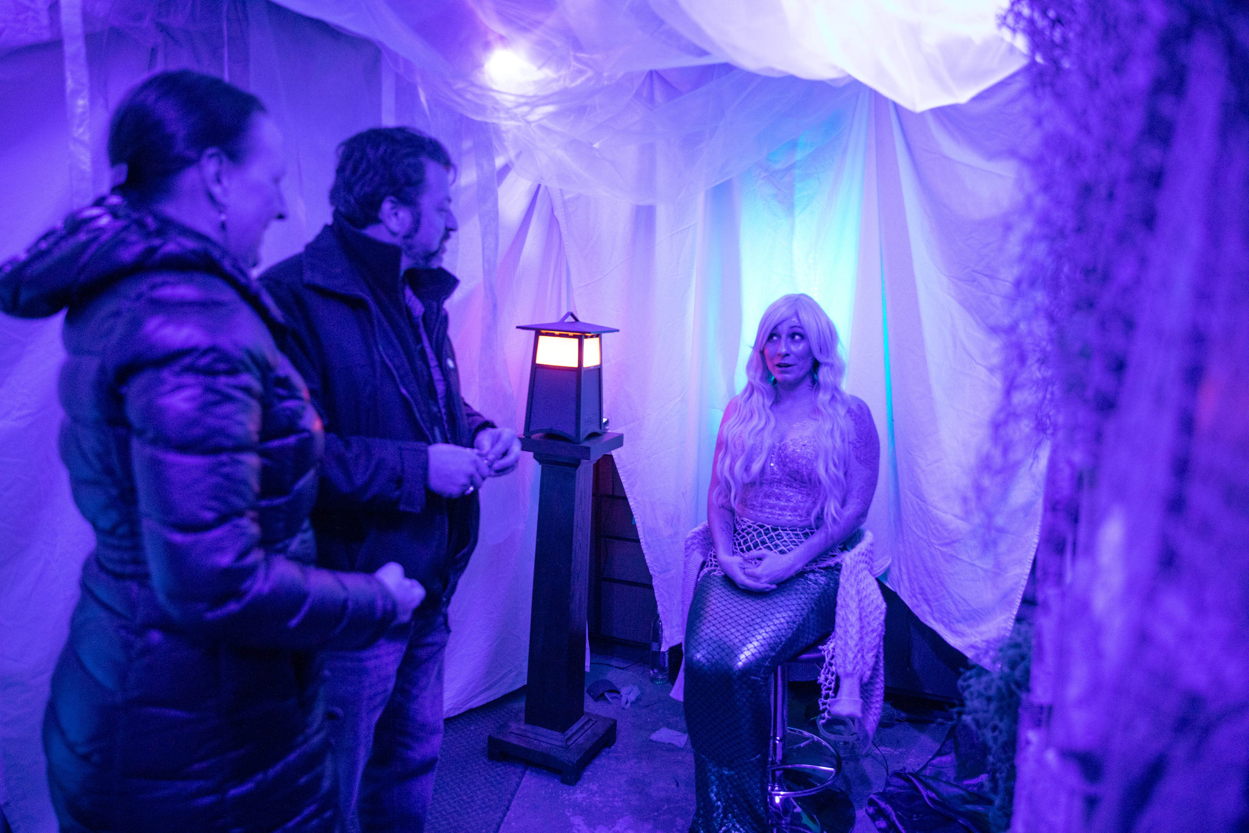 “Krampus Claws” was divided into three acts with an intermission between each act. As the audience mingled and consumed Krampus-inspired snacks, treats, and ciders (both hot and alcoholic), costumed members of the troupe pulled individuals or small groups of people to visit with the spirits of water, air, and fire. Each of these experiences, which were elaborately presented in smaller spaces, yielded a token: a rubber “fireball,” a kazoo, and a small water pistol. Participants were asked to hang on to these and to keep them hidden. In the third ‘act,’ which was primarily conveyed using shadow puppets, Gryla and her brood slipped their bonds and prepared to wreak havoc on the children of Earth. But at the last minute they were turned back by Krampus, freshly motivated by his new, more nuanced moral understanding. In fact, he has come to see that it’s now Gryla who is misbehaving and in need of punishment. Finally, Krampus and the narrator of the story rallied the audience to defeat the Icelandic folk monsters, including the Yule Cat, with their fireballs, kazoos, and water pistols. Thus, another merry Christmas was assured and the balance of the universe maintained.