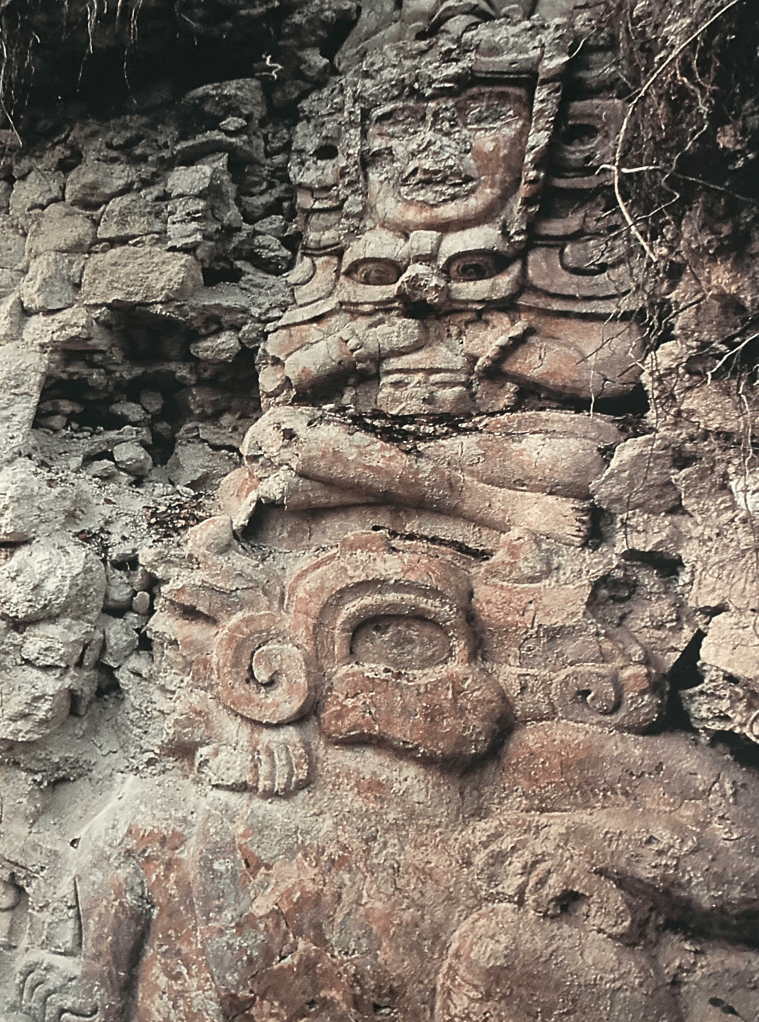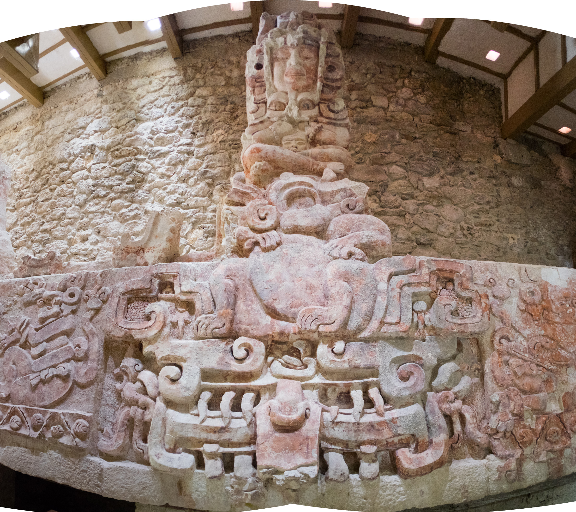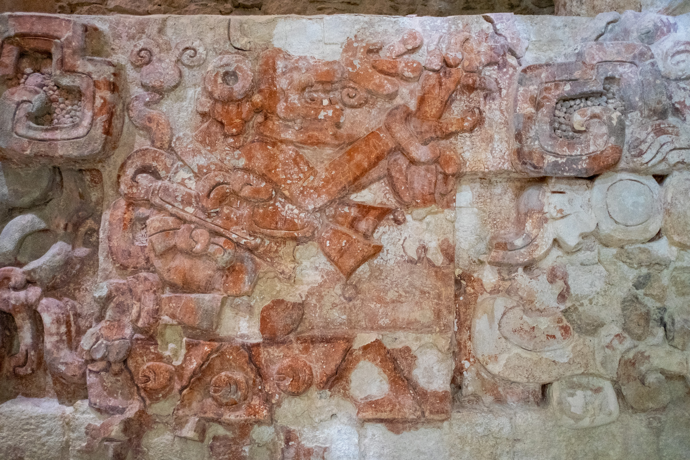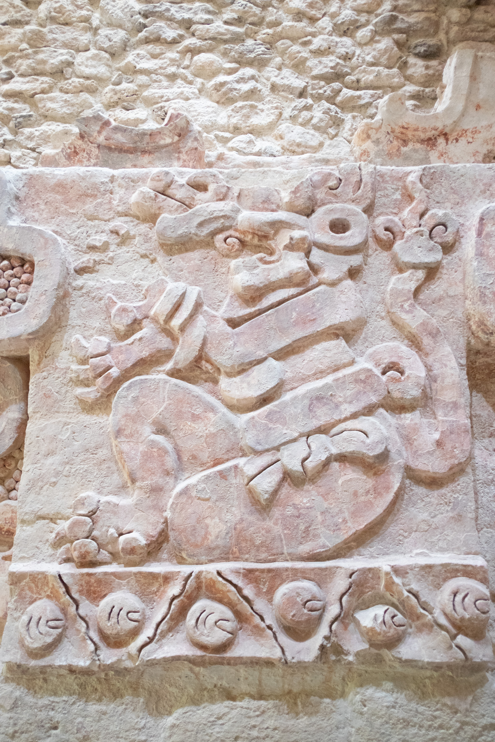 We travelled to Calakmul in Campeche, the heart of the Mexican Petén. Once the capitol of the Kingdom of the Snake, Calakmul now lies at the end of dusty, bumpy road in the Calakmul Biospheric Reserve. Famous for its spectacular pyramids, seeing it was the high point of our second trip to the Yucatán Peninsula. But while Calakmul is architecturally and historically important, the exteriors of the ruins are badly preserved and are virtually devoid of the stucco sculpture that the Maya are known for. So for a bit of a palette cleanser, it’s nice to add Balamkú, a nearby site, to your journey. Over the course of three visits to the Mayan world we saw many examples of architectural sculpture, the frieze at Balamkú was one of the most impressive. Not only is it one of the largest—about 60 feet wide— it’s among the best preserved since it remained covered beneath a second building for more than a thousand years.