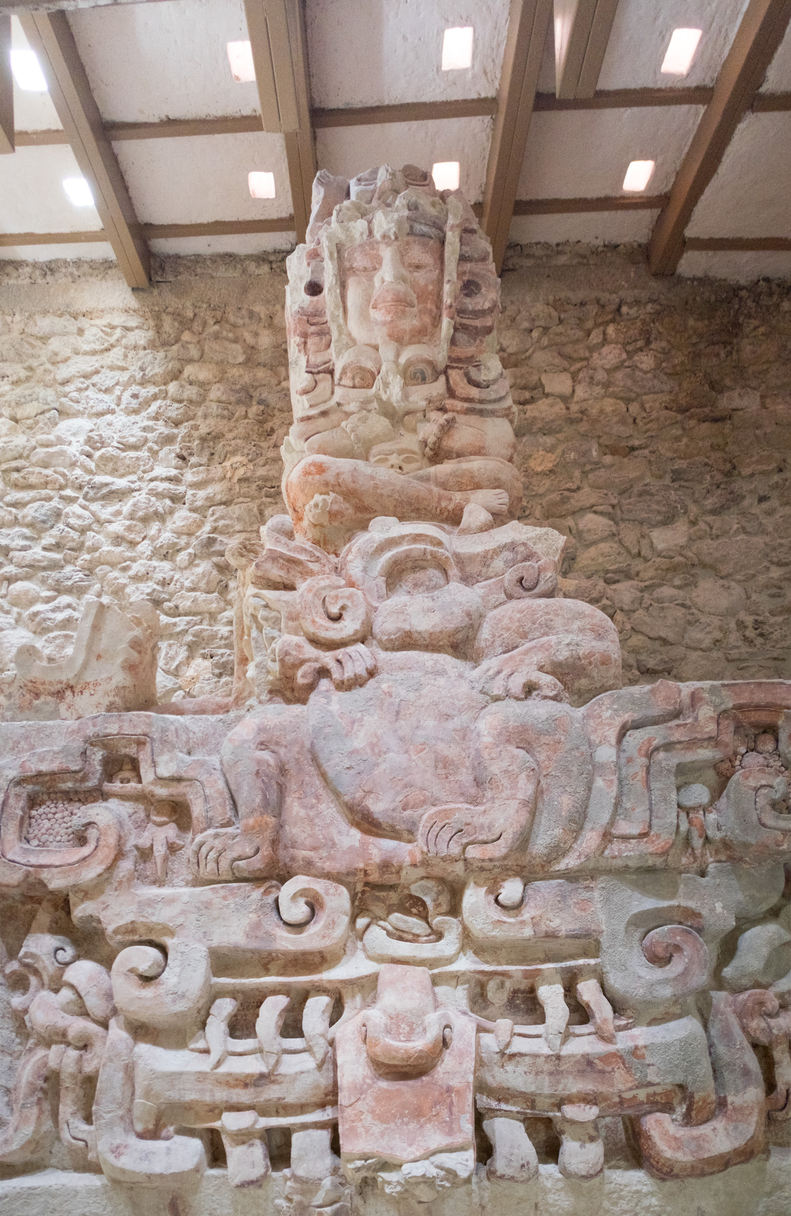As usual, I struggle to fully comprehend Mayan culture. While the foregoing makes sense for a structure that is meant to mark the dynastic importance of a ruler, it would be impossible for me to arrive at that interpretation of the frieze on my own. I don’t have the training, I don’t know how to read the visual imagery. I look at the animal figure beneath the ruler in the photo above, for example, and I see a mouse. Unfortunately for me, it’s a crocodile. I have done some reading on Mayan cultural and religious beliefs, of course. But I think I would have had to start at a much earlier age in order to fully take it in.